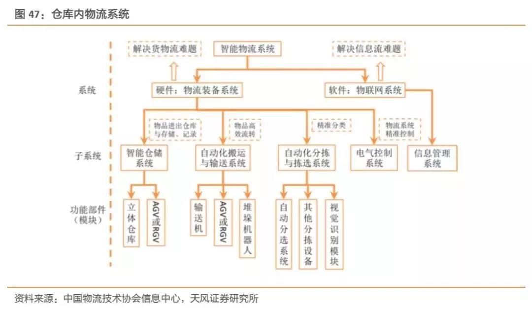 2)硬件:为打造高度自动化作业流程,从仓库拣选到存储的各环节,需引入多种类型的智能设备辅助完成工作,如无人叉车、机器人、拣选AGV、分拨AGV、自动封箱机、自动分拣装备等。