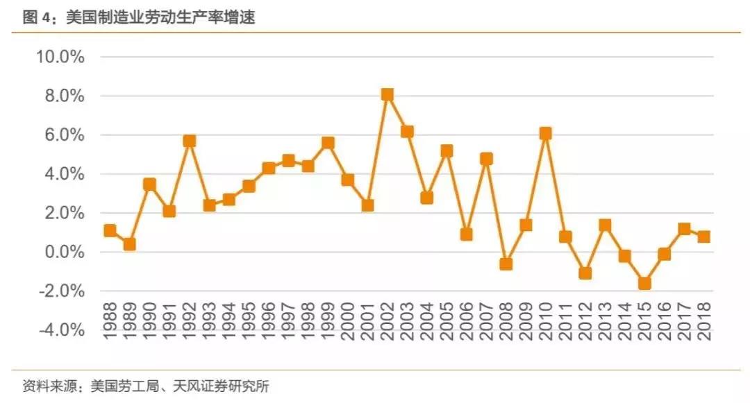 工业互联网有望助力制造业生产率提升。1988至1990年,美国制造业劳动生产率增速乏力,因为工业革命的创新已经达到一个更为成熟的阶段,边际效益消失。1990年之后美国的制造业生产率复苏,广泛的共识是此次生产力加速源自互联网革命及其背后的计算技术所带来的信息与通信技术。中国制造业错过了90年代互联网革命,增速呈明显的整体放缓趋势,制造业生产率提升迫在眉睫。参考互联网助力美国制造业复苏,数据化、信息化是打破生产率瓶颈的重中之重。