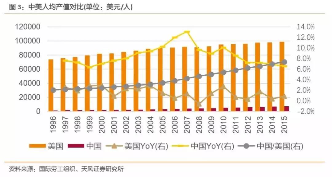 中国劳动生产率增速放缓,提升空间大。根据2015年国际劳工组织数据,中国劳动力人均产值偏低,增速从2007年开始持续回落,2015年人均产值仅为美国的7.4%,差距明显。