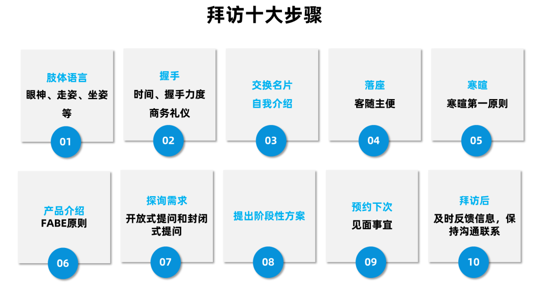 真正拜访客户时,有十个步骤,每一步都有注意事项,可以放在我们公司内部的销售训练里,分别扮演拜访人和被访人,反复训练。