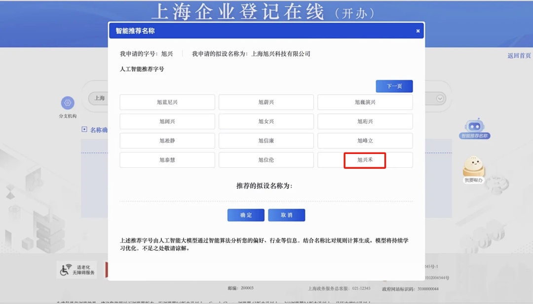 “我希望公司名称中带有‘旭兴’两个字,系统推荐的名字里基本都含有这两个字,所以很轻松就找到了心仪的名字。”日前,上海旭兴禾科技有限公司顺利完成设立登记。