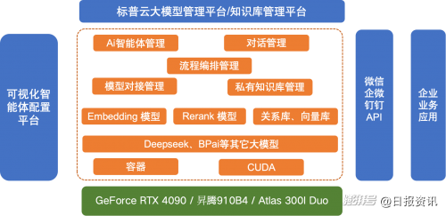 今年2月,标普云发布BPai一体机,整合算力服务器+大模型+AI应用,预置了DeepSeek/BPai企业经营大模型,以及企业客服、办公助手、企业内部知识咨询等3大企业AI 智能体(数字员工),终端全面支持微信、企业微信、钉钉等多平台,让大模型真正实现“开箱即用”。