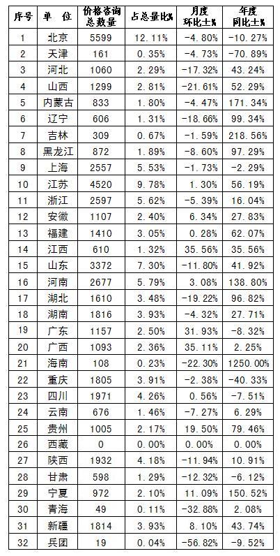 价格咨询数量较为集中的地区有:北京(5599件)、江苏(4520件)、山东(3372件)、河南(2677件)、浙江(2597件)。占全国价格咨询总量的比重分别为:12.11%、9.78%、7.30%、5.79%、5.62%(详见附表3)。