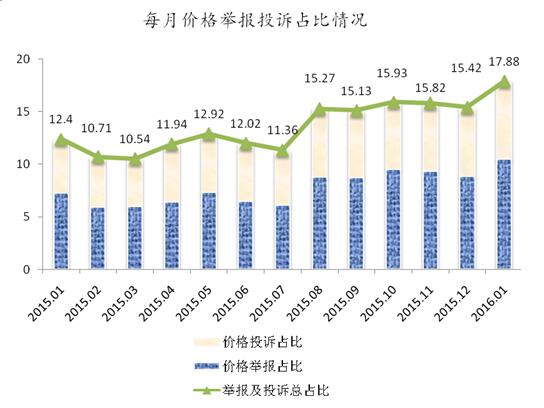 价格举报与价格投诉量占总举报量的权重一年来呈现不断增加的趋势,2016年1月达到平台开通以来最高的17.88%,同比增长44.19%。(如图1)。