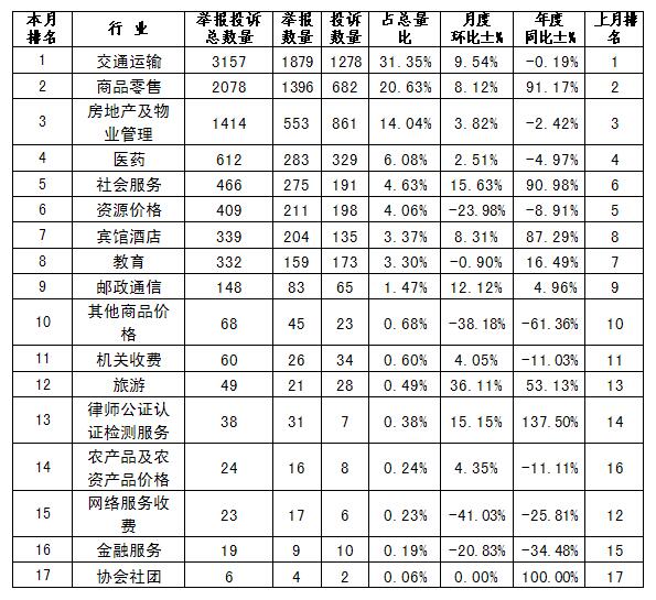 价格举报投诉分行业统计表