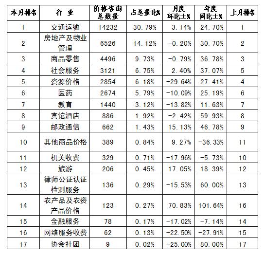 价格咨询数量排名前五位的行业分别是:交通运输(14232件)、房地产及物业管理(6526件)、商品零售(4496件)、社会服务(3121件)、资源价格(2854件)。占价格咨询总量的比重分别为:30.79%、14.12%、9.73%、6.75%、6.18%(详见附表4)。
