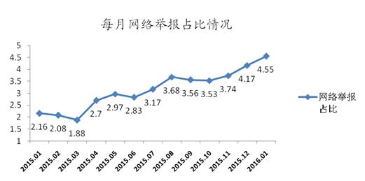 数据显示,作为一种全新的举报方式,网络举报自2015年1月平台正式运行以来,越来越受到群众关注,举报数量逐月上升。2016年1月,网络举报占比为4.55%,同比增长110.65%(如图2)。