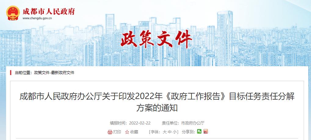 日前,成都市人民政府网站公布了《2022年〈政府工作报告〉目标任务责任分解方案》。除了此前公布的十大民生实事外,成都将2022年全市经济社会发展主要预期目标和重点工作任务细化为448项具体工作,并明确了牵头单位和责任单位等。