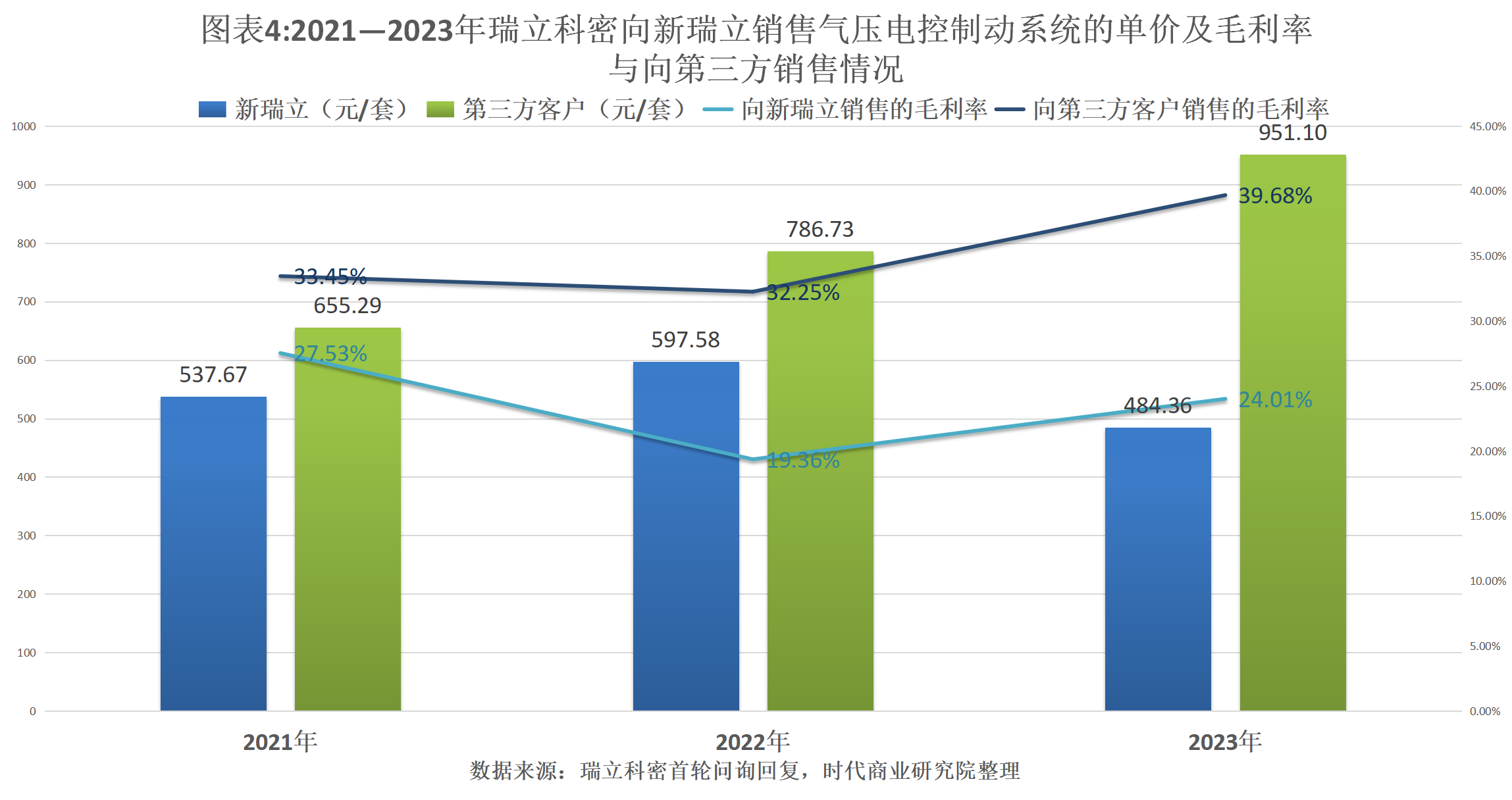 此外,报告期内瑞立科密主要向新瑞立销售气压电控制动系统。2021—2023年,瑞立科密向新瑞立销售的成套单价相当于向第三方客户销售的成套单价的82.05%、75.96%、50.93%,同样远低于第三方客户,并且差距不断拉大。从毛利率来看,2021—2023年,瑞立科密向新瑞立销售的毛利率持续低于第三方客户。