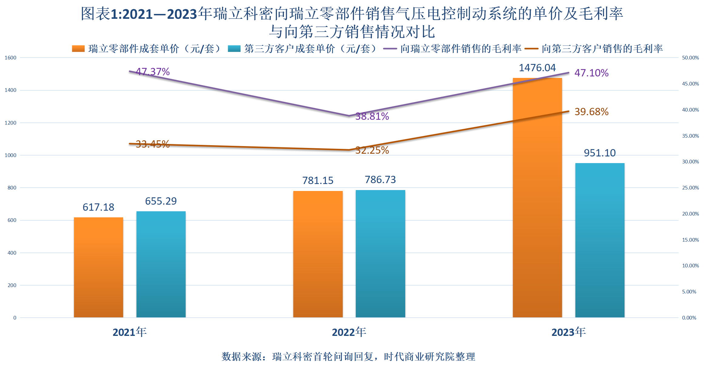 其中,2021—2023年,瑞立科密向瑞立零部件销售的气压电控制动系统成套单价分别为617.18元/套、781.15元/套、1476.04元/套,而对第三方客户销售的成套单价分别为655.29元/套、786.73元/套、951.10元/套。由此计算,瑞立科密向瑞立零部件销售气压电控制动系统的单价相当于第三方客户的94.18%、99.29%、155.19%,即除了2023年,其他年份均低于第三方客户。