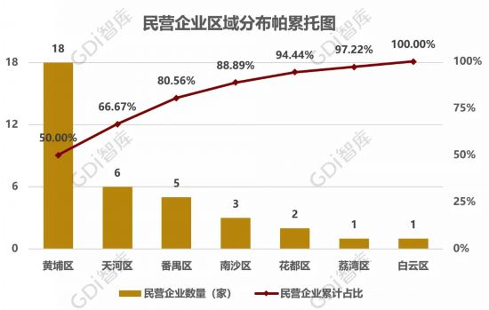 上榜企业中有36家属于民营企业。其中黄埔区18家,占上榜民营企业的一半;其次是天河区6家,占比为16.67%;番禺区上榜企业数仅次于黄埔区和天河区,上榜5家企业,占上榜民营企业13.89%。其中南沙区、白云区上榜“广州企业创新TOP50榜(2020)”均为民营企业。