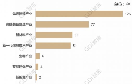 国际专利数是反映企业知识产权国际化程度的重要指标,它集中体现专利发明的国际认可程度。本次上榜企业的平均国际专利数是46件。其中,先进制造产业以126件的数量领先于高端装备制造产业(77件)和新材料产业(53件)。