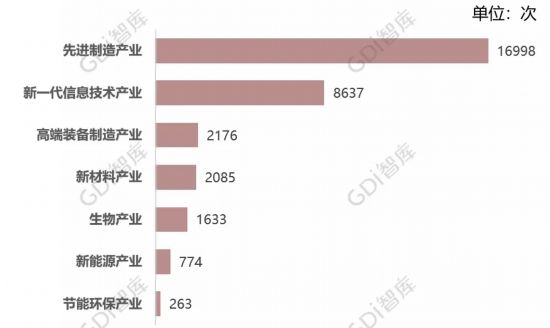 同族专利被引频次是指某一发明专利在其他企业的被引次数,可用以反映专利影响力的一个重要指标。榜单显示,上榜企业属于先进制造产业平均同族专利被引频次遥遥领先,达16998次。新一代信息技术产业平均同族专利被引频次达8637次,位居第二。排名前五的其他三大产业分别为高端装备制造产业(2176次),新材料产业(2085次)和生物产业(1633次)。