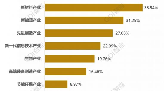 在本次上榜企业中,专利授权率居前三位的产业为新材料产业、新能源产业和先进制造产业,专业授权率依次为38.94%、31.25%和27.03%,表明这三类产业企业创新质量位居前列。