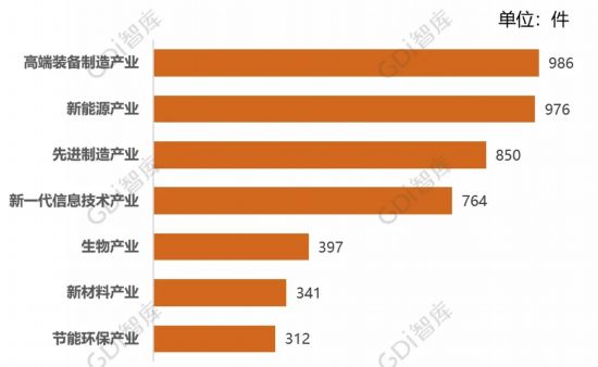 发明总量是评价企业创新能力最重要的指标之一,也是企业创新实力最直观的反映。根据产业类型对上榜企业进行划分,高端装备制造产业平均发明总量最多,企业平均公开量为986件。新能源产业紧随其后,企业平均公开量为976件。先进制造产业以850件的平均公开量位列第三。