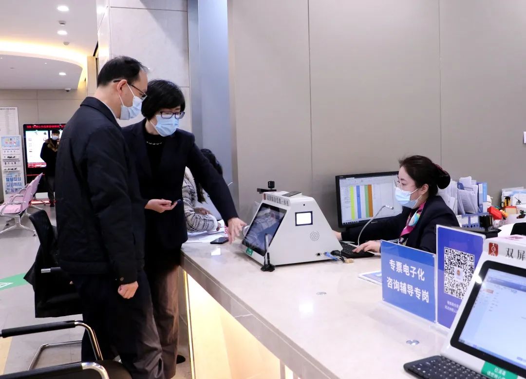 在黄浦区税务局电子税务服务区与行政服务中心税务专窗,李俊珅同志实地参观了“电税先行、人工托底”的办税模式,亲自体验了“闪训”课堂、触控屏教学,切身感受了新办企业“一窗通办”的服务速度。