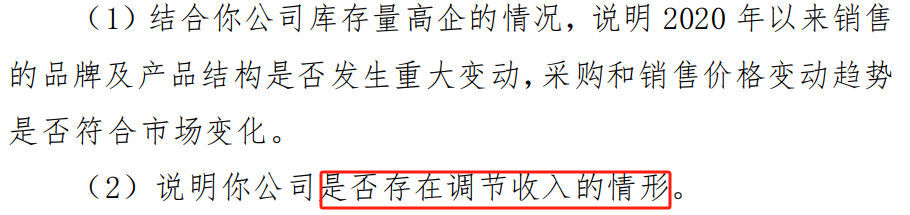 深交所要求公司结合库存量高企的情况,说明2020年以来销售的品牌及产品结构是否发生重大变动,采购和销售价格变动趋势是否符合市场变化;以及说明是否存在调节收入的情形。