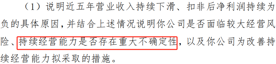 赫美集团近五年营业收入持续下滑、扣非后净利润持续为负,交易所要求说明具体原因,并结合上述情况说明是否面临较大经营风险、持续经营能力是否存在重大不确定性。