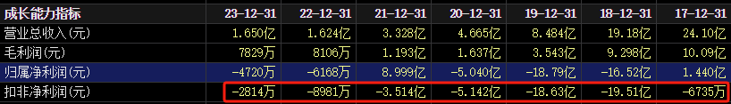 实际上,从2017年至2023年,赫美集团营业收入都是持续下滑的,归属于上市公司股东的扣除非经常性损益的净利润则均为亏损。