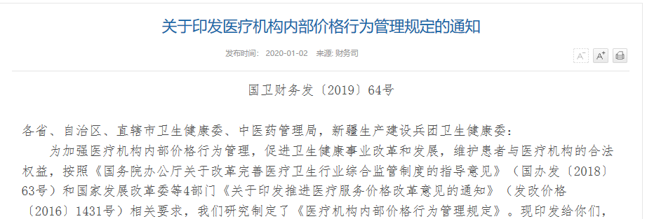 2020年1月2日,国家卫生健康委和国家中医药管理局联合印发《医疗机构内部价格行为管理规定》(下称《规定》)。《规定》共七章二十八条,旨在强化医疗机构价格管理意识和内部价格管理部门职责,明确部门设置、人员管理、职责任务、管理机制等具体内容。