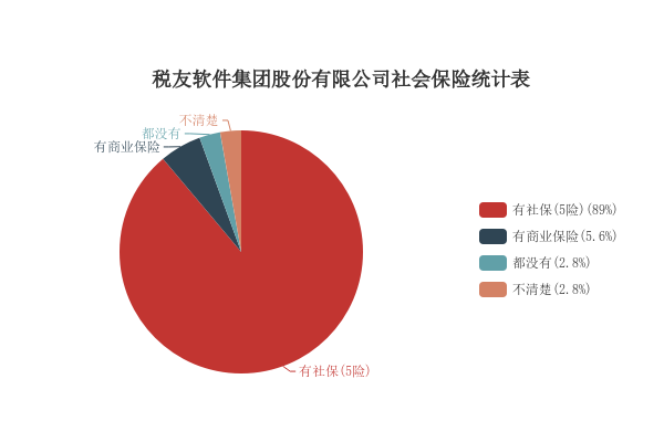 在税友软件集团股份有限公司工作的人88%的反馈有社保(5险),5%的反馈有商业保险,2%的反馈都没有,2%的反馈不清楚,具体见以下统计图。