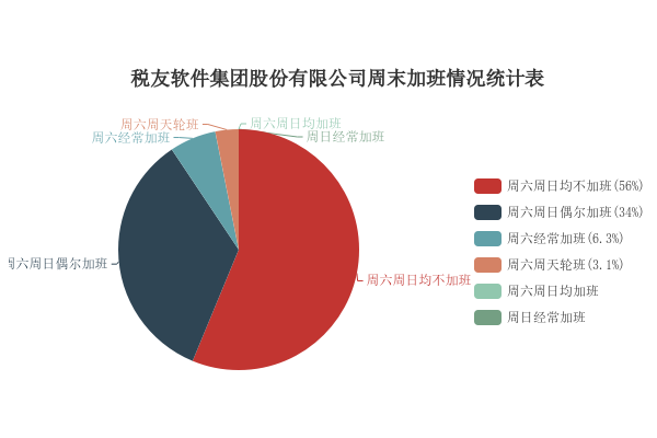 在税友软件集团股份有限公司工作的人6%的反馈周六经常加班,34%的反馈周六周日偶尔加班,56%的反馈周六周日均不加班,3%的反馈周六周天轮班,具体见以下统计图。