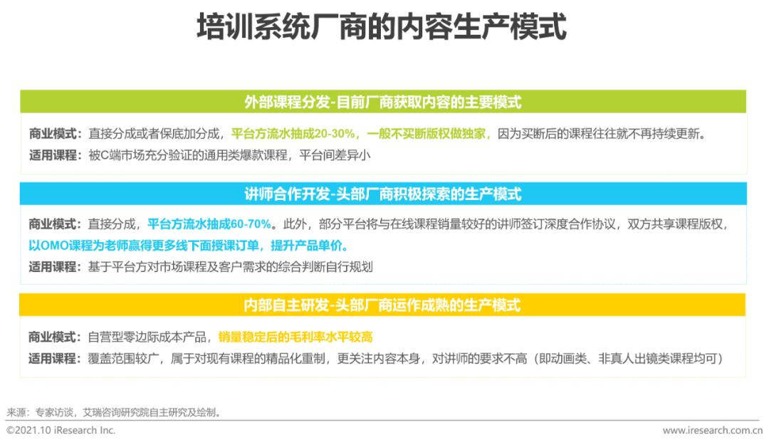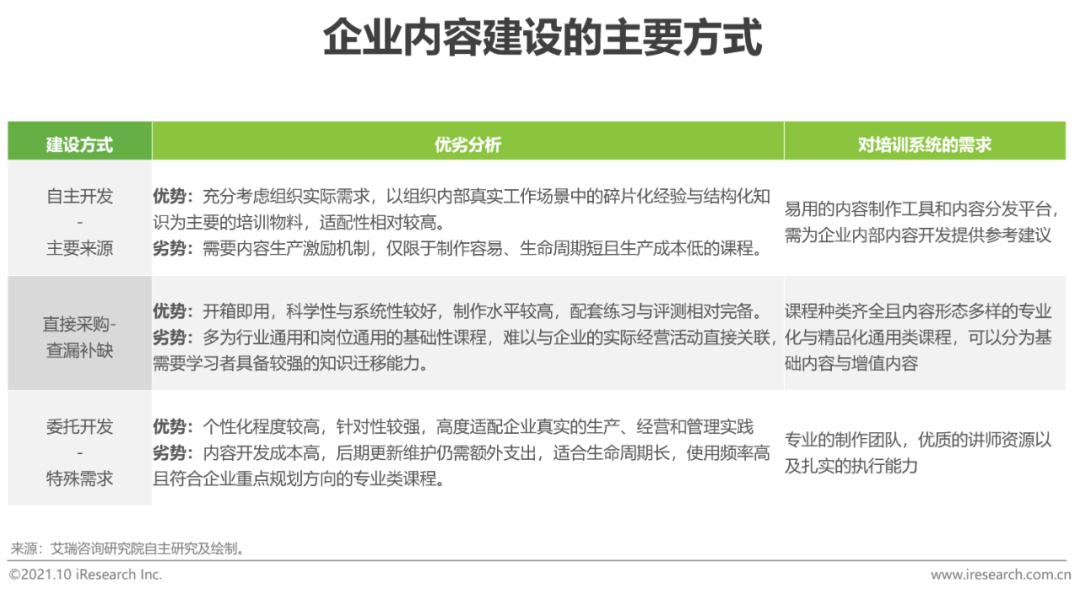 企业内容建设方式主要分为自主开发、直接采购和委托开发,不同的建设方式适用于开发不同类型的课程,也需要培训系统提供不同的工具、产品及服务,随着企业越来越重视内容的适配性,在功能丰富又操作简易的内容制作工具的帮助下,自主开发的内容将成为内容体系的主要组成部分。从培训系统的角度来看,可持续的优质内容供给能力是厂商建立差异化竞争优势的基础,这关乎厂商的选品能力和研发能力,归根结底是一种质量控制能力。短期来看,与众多第三方内容厂商合作能够迅速提升课程商城的容量,让企业有更多选择;但长期来看,厂商不仅需要为企业提供一揽子精品化课程组合,降低企业的采购决策成本,还需夯实自身的课程研发能力,联合师资端资源,提供混合式的课程交付,丰富课程交付形态。