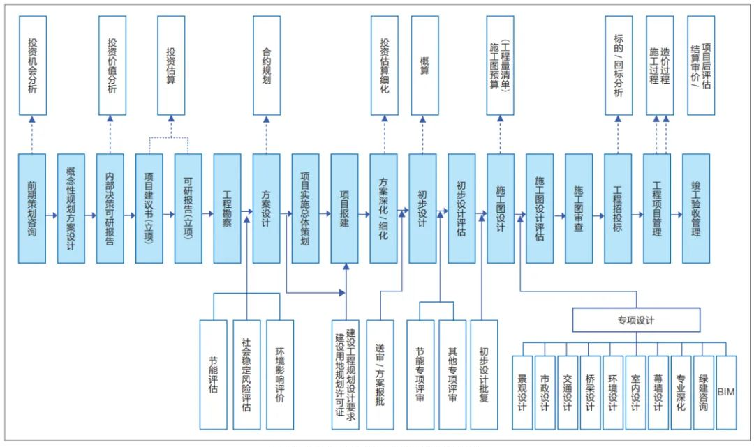 勘察设计企业发展全过程工程咨询业务,不应该把工作内容与任务仅仅固化于勘察设计阶段,而应该积极主动探索服务链的前后延伸,为全过程工程咨询与管理服务开辟道路。设计向前延伸,拓展项目前期策划、项目需求分析、方案优化比选等服务能力,同时应关注项目管理、招标采购、造价咨询、施工阶段技术服务等管理与咨询工作能力。