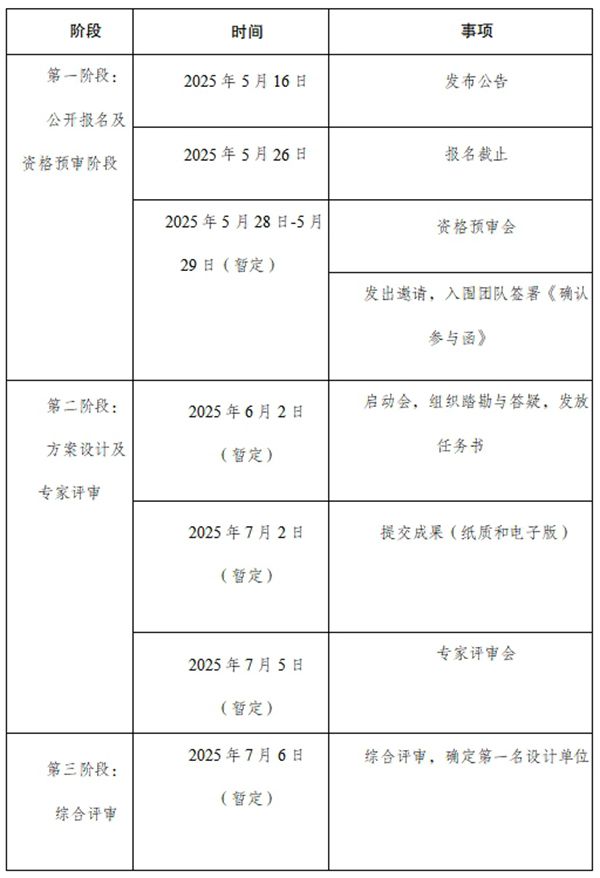 (一)本次征集活动分为三个阶段。第一阶段为公开报名及资格预审,时长约10天;第二阶段为方案策划及专家评审,时长约50天;第三阶段为综合评审。