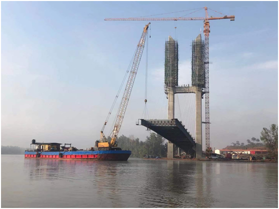 几内亚跨斜拉桥工程 该项目位于几内亚博法省,距下游 N3 公路跨Fatala河桥梁约 5 公路,距大西洋入海口约 26 公里。本桥为斜拉桥,跨度布置为(44+64+270+64+44)=486m,桥宽 11m,主梁采用边主梁形式的钢板梁结构。主塔为H形钢筋混凝土结构,塔内设检修爬梯。斜拉索采用平行钢绞线斜拉索,桥面处斜拉索设外置式阻尼器。主塔基础采用钻孔桩群桩基础;辅助墩采用钢筋混凝土桩柱式结构,桥台采用重力式桥台及群桩、扩大基础。主桥支承体系为半漂浮体系,主塔、辅助墩两侧均采用双向活动支座,桥台一侧设置单向活动支座,另一侧设置双向活动支座。主塔处横向设置抗风支座。