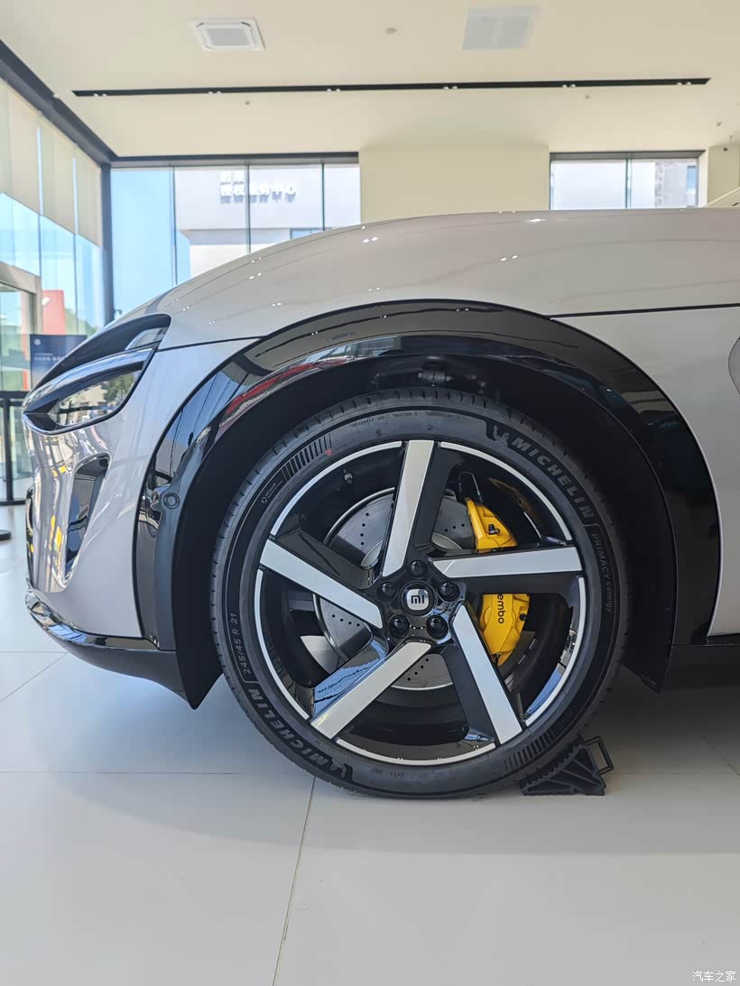 21寸锻造米其林轮胎,45面宽,单看这个轮毂就不便宜,看着比小米SU7用19寸轮胎更大气,黄色的四活塞卡钳也很有辨识度,还是全系标配。