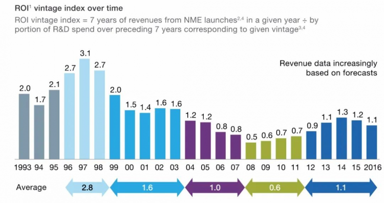 2008年金融危机席卷全球,风暴影响到跨国药企巨头。麦肯锡作了一番统计,研究了过去20年里新药的研发产出比,发现2008-2011那几年是全球医药行业的“低谷期”。