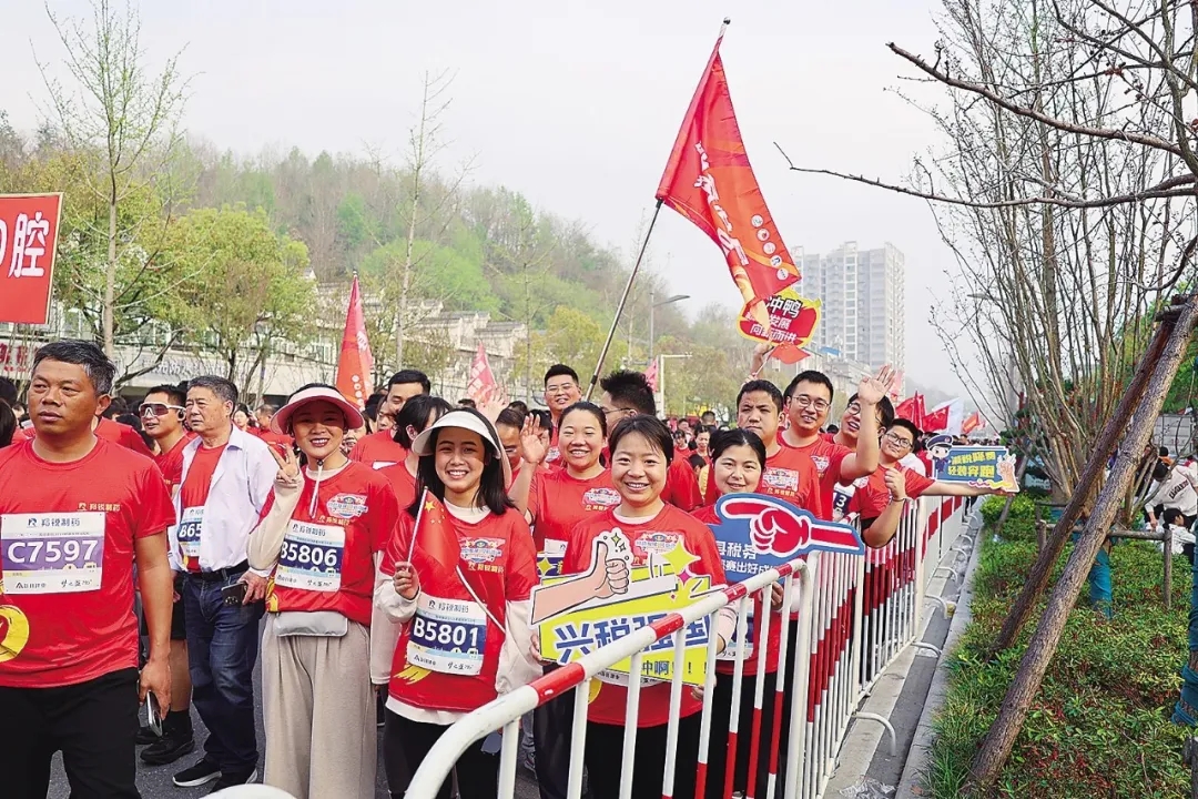 (日前,河南省新县举办半程马拉松比赛,国家税务总局新县税务局干部报名参赛,并向群众宣传税费政策。林映慧 摄)