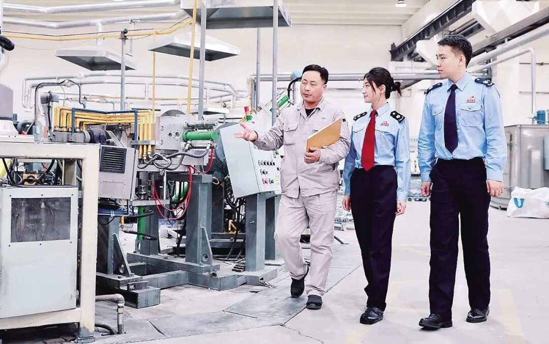 (近日,国家税务总局阜新高新技术产业开发区税务局开展“春风送惠助科企”活动,走进科技企业了解情况、宣传政策、解决难题。图为该局干部在阜新中孚轻金属科技有限公司生产车间走访。满大千 朱俊萤 摄)