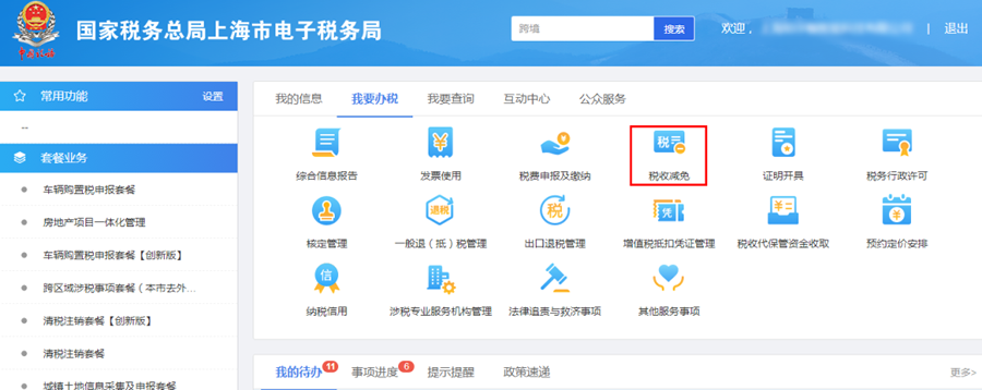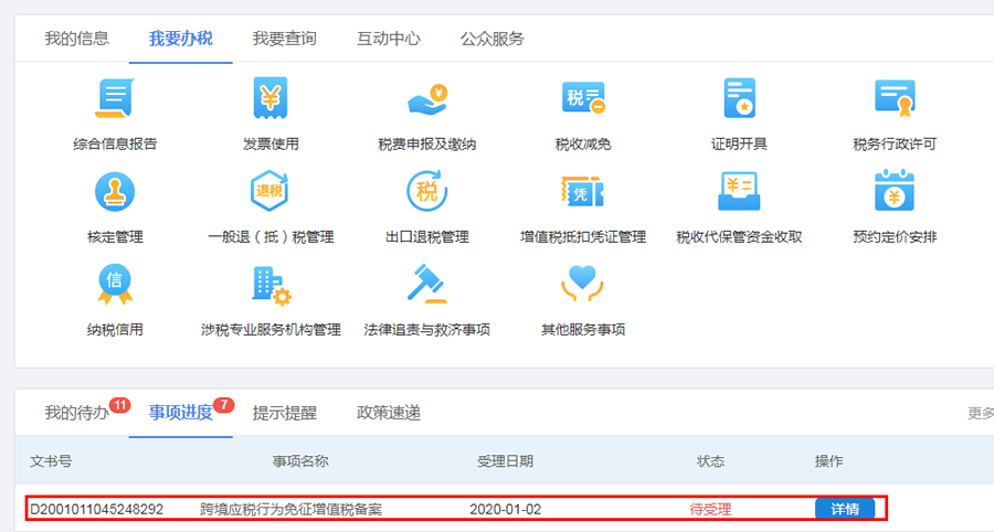 答:登录电子税务局,点击菜单栏中“我要办税”中的“税收减免”模块,在弹出页面右侧选择“跨境应税行为免征增值税报告”,点击进入办理页面。