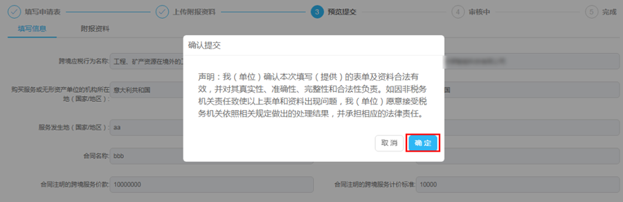 若有问题,可点击“上一步”进行修改;若确认无误,点击“提交”。