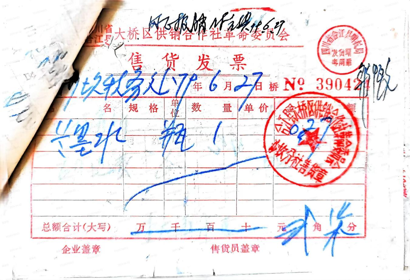 “1979年6月27日开具,金额0.27元。”这是此次收集到的最早的一张售货发票,也是较早的一批手工填制发票。据合江县税务局税务干部李湘回忆,这张发票是他爷爷在供销合作社购买墨水时开具的,一直被收藏于家中,已经有40余年的历史。虽然当时税法知识的普及度有限,但买东西要索取发票的意识,已经在人们心中埋下种子。
