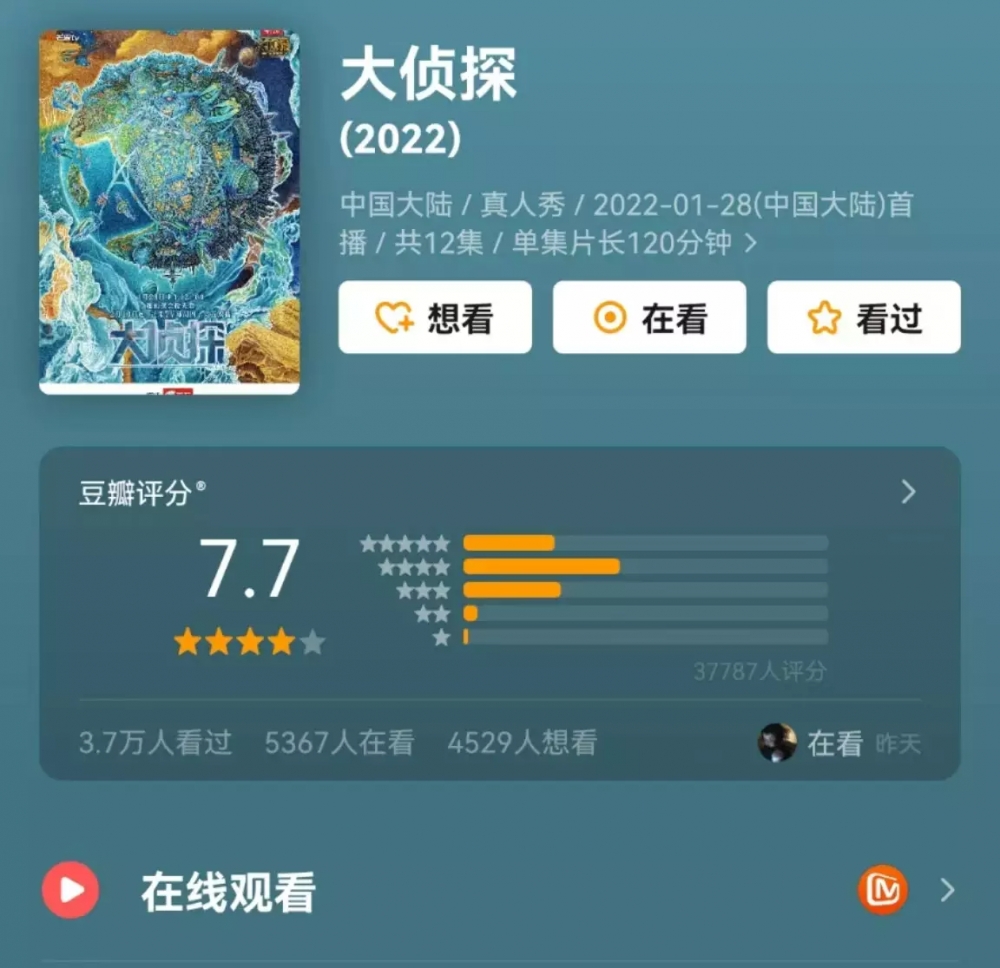 《大侦探》也就是《明星大侦探7》,之前六季评分不断降低,这一季直接刷新了最低分,豆瓣评分只有7.7。不少观众吐槽:“没有撒贝宁越来越尬了”、“下饭综艺变催眠综艺”、“为流量放弃原班人马,居然抄起了游戏”等,但也有老粉表示支撑:“万水千山也有尽头,但我依然满怀期待。”
