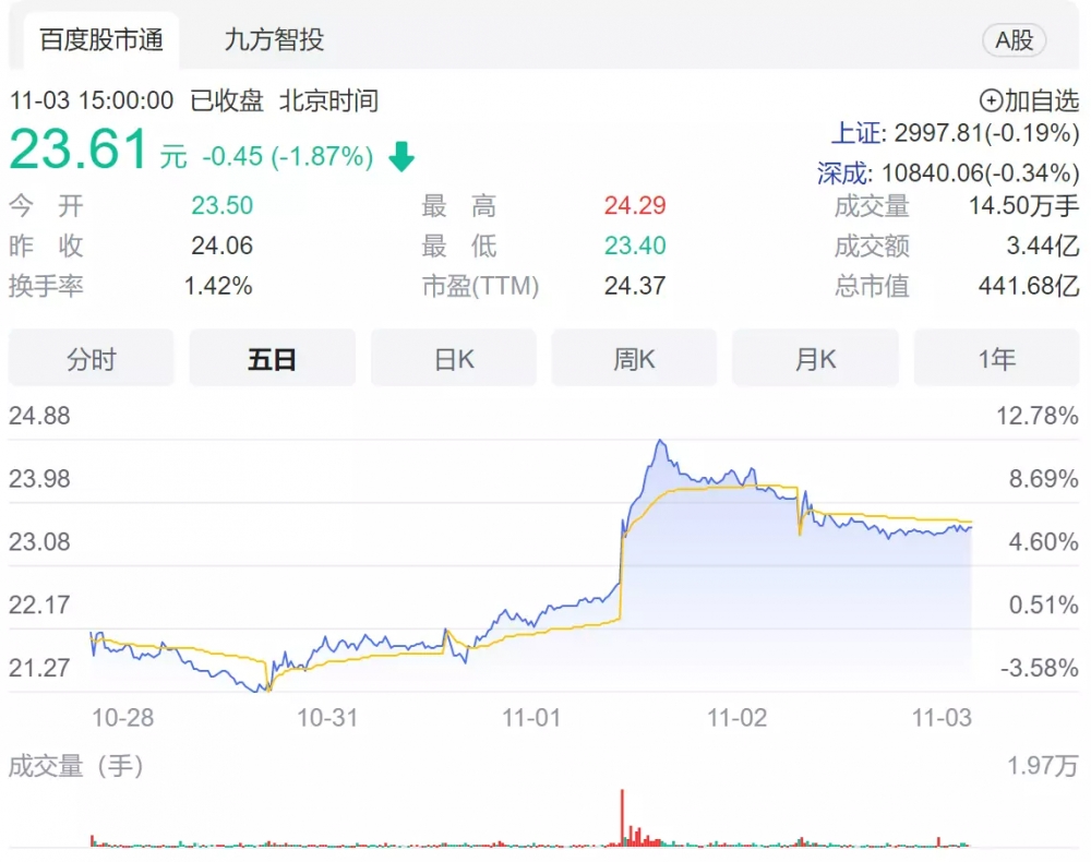 年初至报告期末,芒果超媒共计实现营业收入102.39亿元,同比下降11.97%;归属于上市公司股东的净利润16.78亿元,同比下降15.24%。截止发稿前,芒果超媒股价为23.61元/股,总市值441.68亿元。
