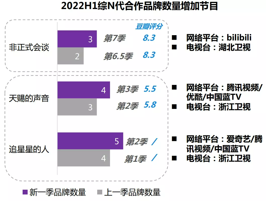 据艺恩数据的《2022上半年综艺赞助市场研究 》显示,上半年合作品牌超10个的综N代仅2部,不及去年同期的四分之一;新综艺虽整体吸金力较综N代略弱,但合作品牌超7个以上的“中坚力量” 增长较多,可以说此消彼长。