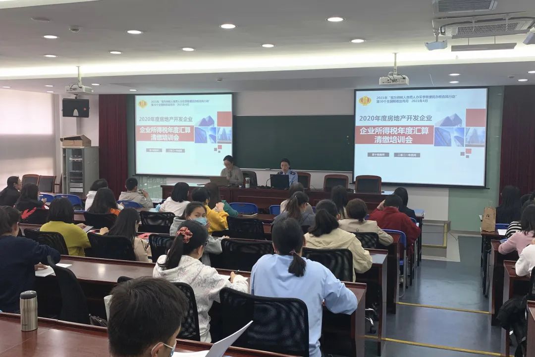 嘉定区税务局与第三方事务所联合举办房地产行业企业所得税汇缴培训会。为了扩大培训覆盖面,此次培训采用线上+线下形式,内容涉及操作要点、报表变化、汇缴基础政策以及房地产特定业务纳税调整等方面进行讲解。
