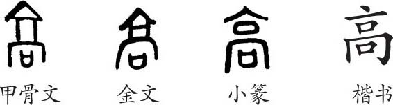 “高”是象形字。甲骨文像台观楼阁上下重屋之形,表示崇高。金文、小篆整齐化,变得不太像楼阁了。隶变后楷书写作“高”。