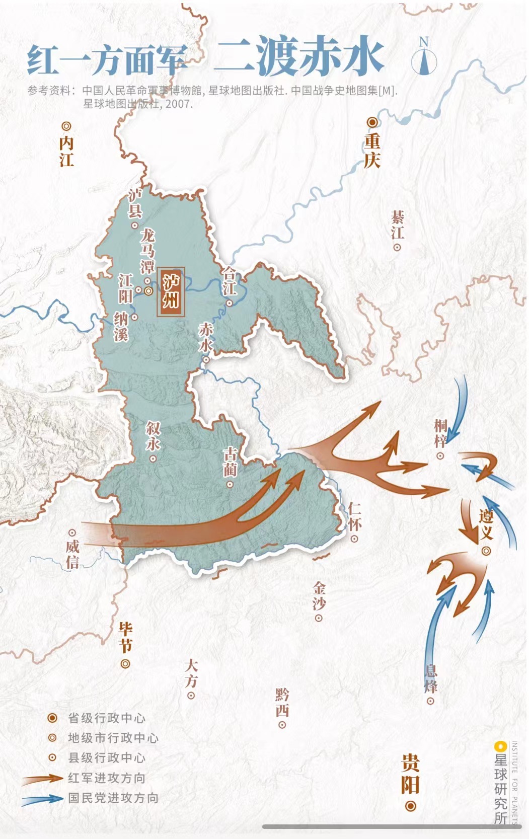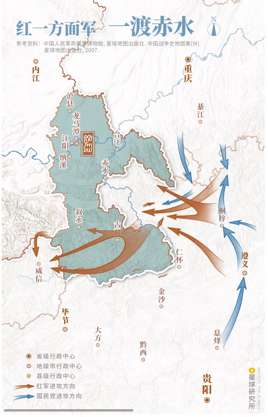 请查看四渡赤水战争路线示意,其中一渡、二渡均在泸州 | 制图@吴昕恬/星球研究所