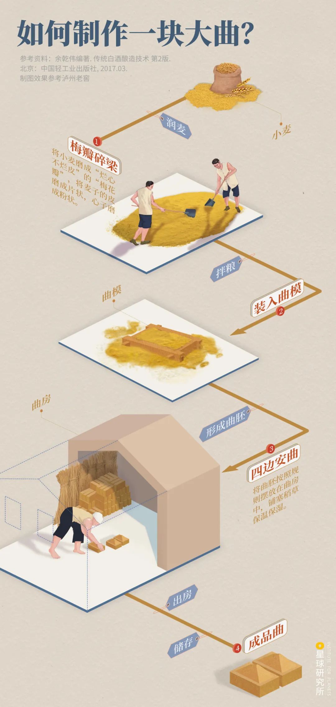 大曲制作工艺流程示意图,宋元时期泸州便开始以大曲酿酒 | 制图@王天怡/星球研究所
