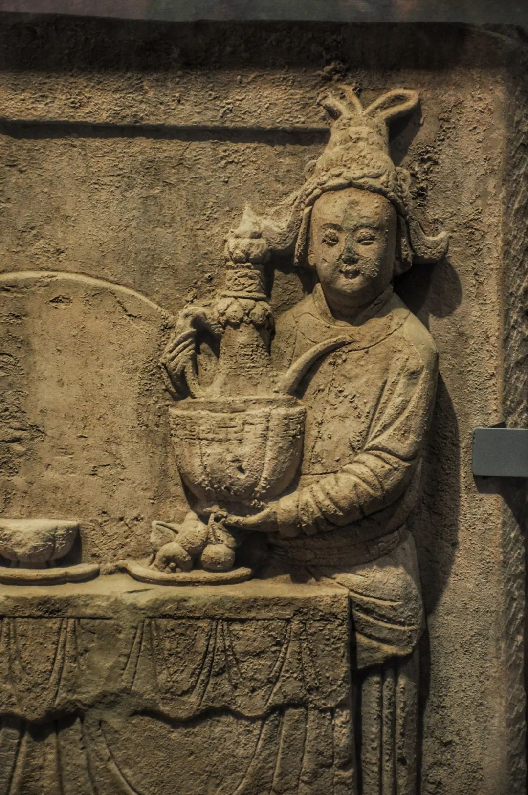 宋代石刻,图中侍女手持酒瓶,藏于泸县宋代石刻博物馆 | 图片来源@视觉中国