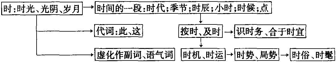 ②由“光阴”引申指“时间的一段”。名词。①时代。《楚辞·离骚》:“固时俗之流从兮(本来时代习俗就随波逐流啊),又孰能无变化(又还有谁能够意志坚定)?”现如:唐时;宋时。②一年中的一季。季节。《荀子·不苟》:“天不言而人推高焉 (上天不讲话,人们认为它最高),地不言而人推厚焉(大地不讲话,人们认为它至厚),四时不言而百姓期焉(春夏秋冬四季不讲话,老百姓都预知节气的变化)。”现如:四时。③时辰。我国古代把一昼夜分为十二时辰。《儒林外史》第十回:“天生一对好夫妻,年月日时(时辰) 无一不相合。”现如:子时;丑时;寅时;卯时。④小时,一昼夜的二十四分之一。郭沫若《洪波曲》:“二十一日离开汉口后,二十三日上午十一时(小时) 到达新堤。”现如:他用三时二十分跑完全程。⑤时候。《庄子·养生主》:“方今之时(当今的时候),臣以神遇而不以目视(我只凭感觉跟它接触,却不用眼睛细看)。”现如:平时;忙时;盛极一时。⑥点。如:八时上班;十二时下课。