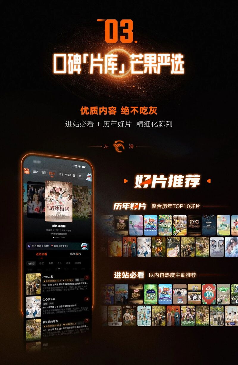 不再是“你找内容”,而是“内容找你”。全新的芒果TV APP,首页像一位熟悉你多年的老朋友,直接为你呈现想看的内容。平台基于你过往的观看偏好与全站内容热度,运用多维度算法预测你的兴趣点。此外,你还可以通过左滑或右滑两种看片方式探索更多内容。左滑进入更深的精选区,右滑则进入无限刷片的沉浸区,打造“专属片单”,让“找片”变成一次轻松、自然的探索过程。