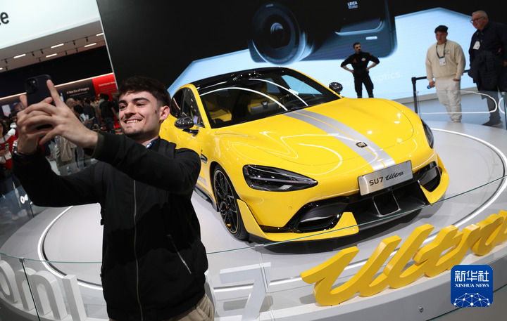 2025年3月6日,在西班牙巴塞罗那举行的2025年世界移动通信大会上,一名男子和小米汽车合影。新华社记者 赵丁喆 摄