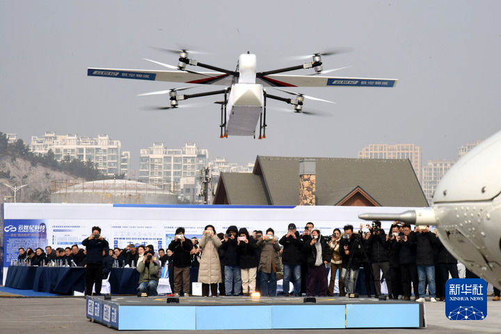 2025年2月27日,青岛首条海岛低空物流航线开通,从灵山岛上飞来的无人机准备降落在青岛西海岸新区积米崖码头。新华社记者 李紫恒 摄