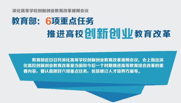 教育部部长:全面深化高校创新创业教育改革袁贵仁强调,深化创新创业教育改革是一项深入细致、艰巨繁重的长期任务、系统工程,各高校要以深化创新创业教育改革统领学校改革发展的各项工作,深化和弘扬育人为本、知行并举、协同育人的理念,以教育理念的深刻变革带动人才培养质量的全面提升,形成全社会关心支持创新创业教育和学生创新创业活动的良好环境。
